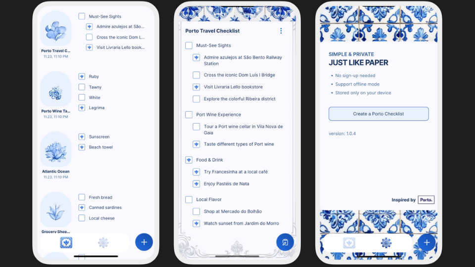 You might think, "Another to-do app?" But the significance of this app lies in executing it in a direction I've never tried before. The most striking thing I noticed in Porto was the blue tiles called Azulejo. These tiles can be found throughout the city - in cathedrals, train stations, and even ordinary homes - and they're truly beautiful when they harmonize with the blue sky. Originally, I had designed the app in a neumorphism style, but due to my lack of sense and motivation, progress was sluggish. However, designing the app with azulejo was so enjoyable that I was able to create and implement it in just a few days with the help of Midjourney.